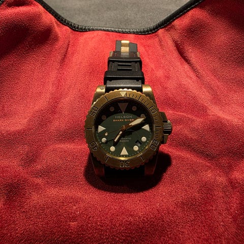Søgeord: Helson Sharkmaster 300, Big Triangle, Seamaster 300 165.024, lyre lugs, no-date, 300 m, Miyota 9039, full lume bezel, vintage diver.
