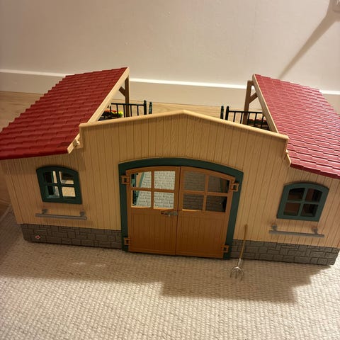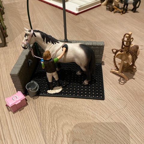 Schleich vaskeplads, hest og person. Den er i god stand og parat til at lege med! Der er tilbehør til hesten så som grime, hø, dækken, striglekasse med strigler i og andet. Prisen er 140kr men er åben for bud.