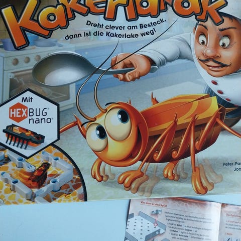 Ravensburger La Cucaracha brætspil med terninger og spillebrikker. Spillet indeholder en plastik kakerlak og er designet til familieunderholdning. Spillet er velegnet til flere spillere og har en underholdende mekanik baseret på terningekast. Komplet. Sender ikke for køb under 200 kr.