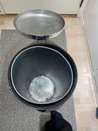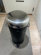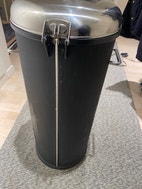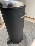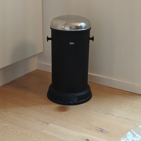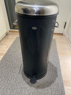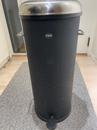 Vipp affaldsspand i sort stål med en kapacitet på 30 liter. Affaldsspanden har en rund form, fodpedal i sort og håndtag i siderne for nem håndtering. Designet til brug i køkken eller andre rum til affaldshåndtering.