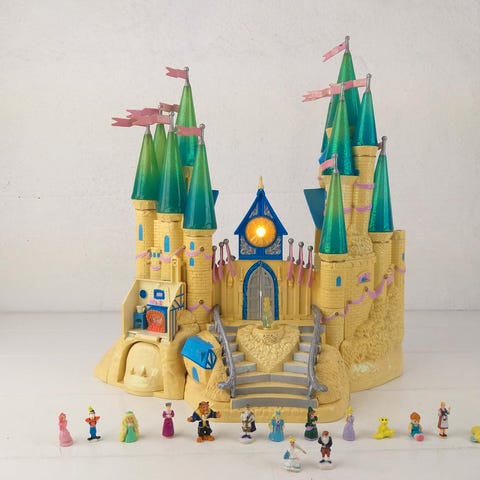 Polle pocket! Disney Prinsesse Slot Legetøj i pink og lilla farver. Sættet inkluderer et slot med flere tårne samt små figurer af prinsesser og tilbehør. Legetøjet er designet til børn og kan bruges til rollespil og fantasilege.