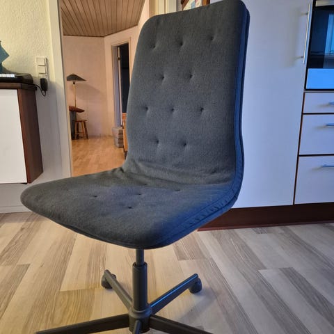 Flot polstret mørkegrå kontorstol med hjul uden pletter på stoffet. Fra røg og dyrefri hjem.