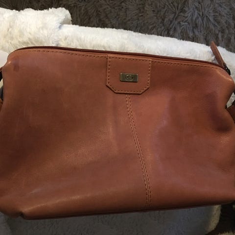 Cognacfart kornert kalveskind, 1. udv. og 1 indv. lomme bege med lynlås. 1 yderligere indv. lomme. Størrelse: bxhxl: 5 cm., 17 cm, 25 cm, svarende til 2 l. Brun læder handskerem medfølger. Nypris 1.300,-