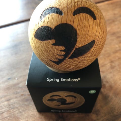 Ukendt Smiley Træbold lavet af træ med en smiley ansigtsudskæring. Kuglen er rund og har en naturlig træfarve med mørkere detaljer, der danner smileyens øjne og mund.