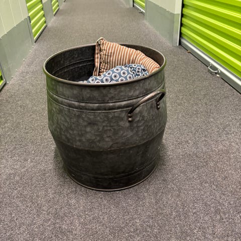 Cool sort metalspand med håndtag. Kan fx bruges til brænde.
