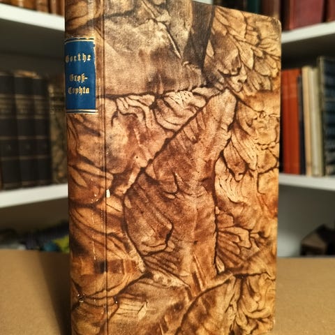 Første separate udgave af dette skuespil af Goethe fra bind 6 af 'Goethes Schriften' (1787-1790). Indbundet i halvlæder med en længere skrift fra 1803. Bruggsport, men overordnet ren.