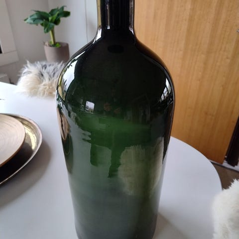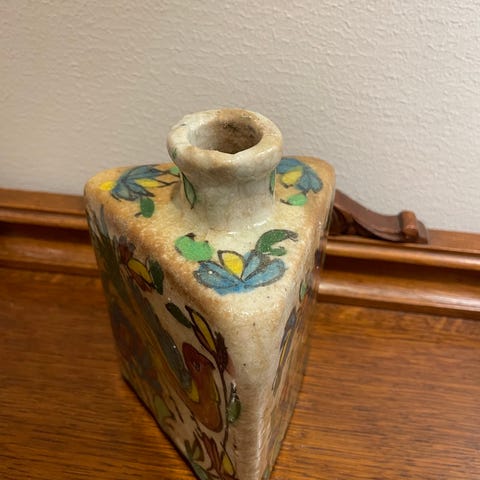 Keramik flaske med firkantet form, dekoreret med håndmalede blomster og fugle i blå, grønne og røde farver. Flasken har en keramisk prop og en mat hvid basefarve..