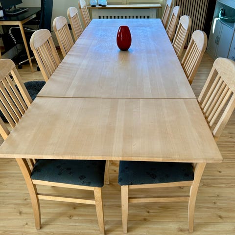 Mål: Bord L179 x B120 cm + tillægsplader á 56,5 cm.