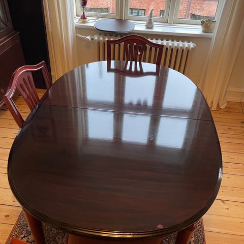 Bordet trænger til en omgang olie, og én stol er limet – ellers fint sæt med masser af charme.