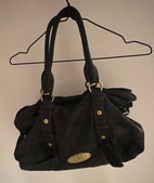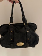 Mulberry Læder Taske designet til kvinder i sort farve. Tasken er fremstillet af læder og har to håndtag. Den har en ovalt formet metalplade med Mulberry-logo. Tasken er rummelig og egnet til daglig brug. Lukkes med en magnet lukning. Enden på stropperne vipper op på grund af den måde tasken er lavet på. Brugsspor.