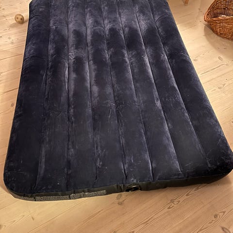 Oppustelig liggeunderlag (luftmadras) i beige og blå farve. Materialet er slidstærkt og velegnet til udendørs brug. Luftmadrassen er foldbart og kan pakkes sammen for nem transport og opbevaring.