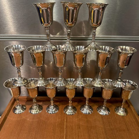 Samling af pokaler og metal bægre i forskellige størrelser og designs.