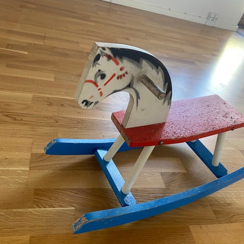 Rød træ rensdyr gyngestol designet til børn. Fremstillet i træ med håndtag og gyngestel, der giver stabilitet og sikkerhed under brug. Egnet til indendørs brug som legetøj og møbel til små børn.
