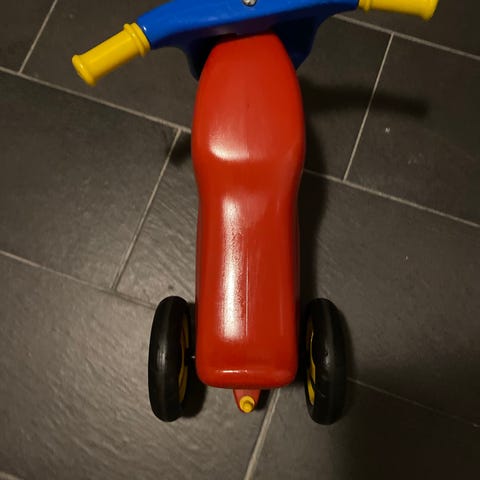 Legetøjsbil i rød farve designet til børn. Udstyret med sikkerhedssele, rat og fodstøtter for øget sikkerhed og komfort. Egnet til indendørs og udendørs leg.