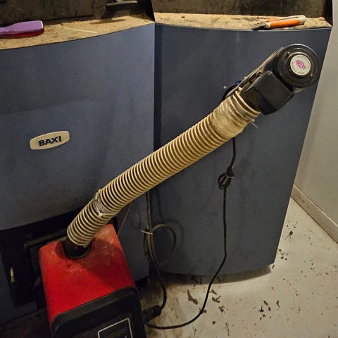 Gejs Alcon 6 med 850 l. stoker. Nedtages i løbet af januar/februar 2026 pga. skift til varmepumpe - kan derfor ses i drift indtil da.