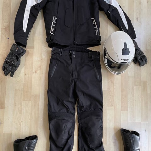 MC outfit, hjelm, jakke, bukser, handsker str 36
