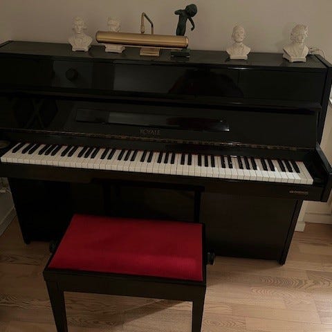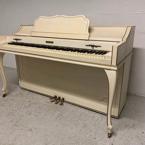 Horning & Møller upright piano i hvid farve. Pianoet har et klassisk design med sort og hvidt klaviatur. Passer til brug i hjem eller undervisningsmiljøer. Bemærk mindre kosmetiske skader på overfladen.