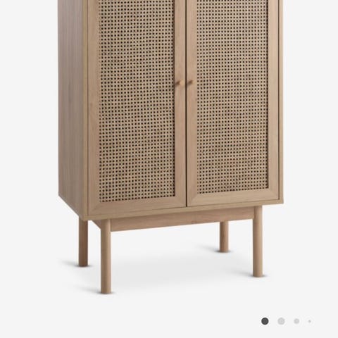 Webster-skab med fræset mønster. Monokromt design med tone-i-tone ben, der giver et moderne, skandinavisk look. Skabet har to låger med soft close-lukning samt to hylder og messingfarvede knopper. Bredde 94 cm, højde 137 cm, dybde 42 cm
