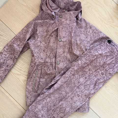 Enfant regntøj i mørkeblå med sølvgråt tryk. Elastik ved håndled og ankler. Fin stand. Str 116 / 6 år