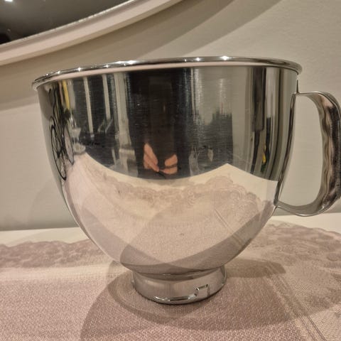 Den inkluderer forskellige tilbehør, såsom en dejkrog, en ståltråd og et fladt piskeris.