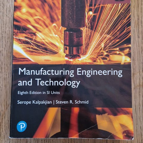 Serope Kalpakjian Manufacturing Engineering and Technology Bog, syvende udgave. Indeholder tekniske illustrationer og information om fremstillingsteknologi og ingeniørarbejde.