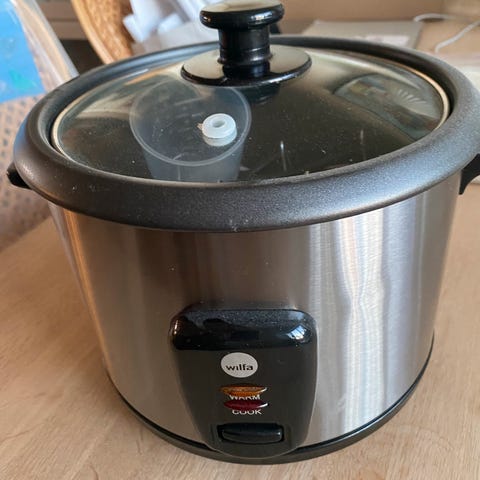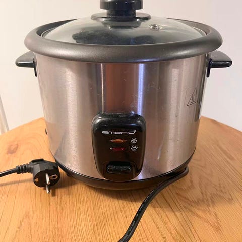 Haws Riskoger med en kapacitet på 5 liter og en effekt på 700 watt. Fremstillet i rustfrit stål og udstyret med non-stick belægning for nem rengøring. Aldrig brugt, har stået i skab. Er blevet lidt ridset i toppen af plastik låg.