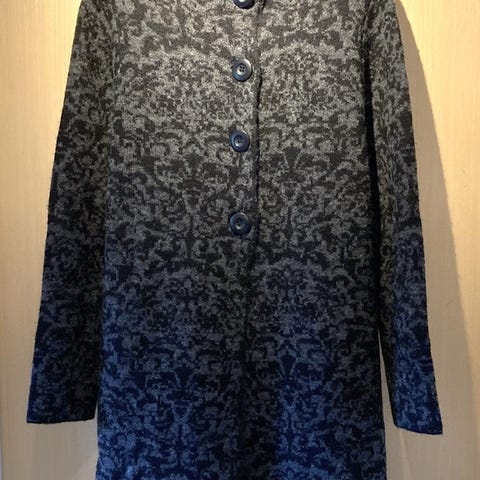 Finstrikket kjole fra Tahari ASL, str. L. Blondemønster foran og på ærmerne, ensfarvet på ryggen. 60% bomuld og 40% rayon (materialet er med meget stræk). Længde 100 cm. Stadig med mærker. Np 225 USD, sælges for 500 kr. pp