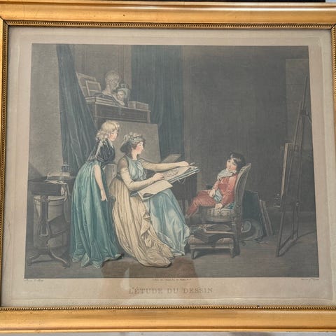 Trykket viser hovedbygningen og haven foran med elegante figurer i forgrunden.