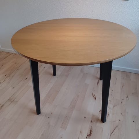 Rundt spisebord i egefiner, som er lakeret for at forlænge holdbarheden. Ø120 x H75 cm