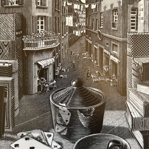Motivet er et perfekt eksempel på Eschers leg med illusion, perspektiv og paradokser.