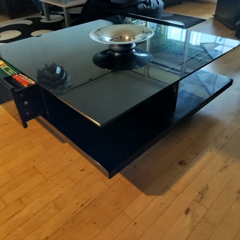 Sort glas sofabord med metalben og hylde