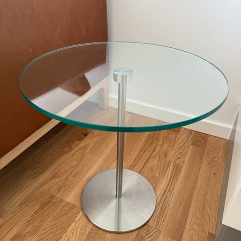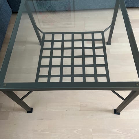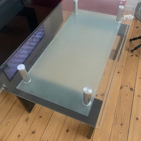 Sofabord med sort glasplade og metalben. Bordet har en ekstra hylde under bordpladen til opbevaring. Mål passer til almindelige stuer og kan bruges til opbevaring og præsentation af genstande i stuen.