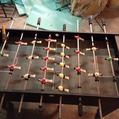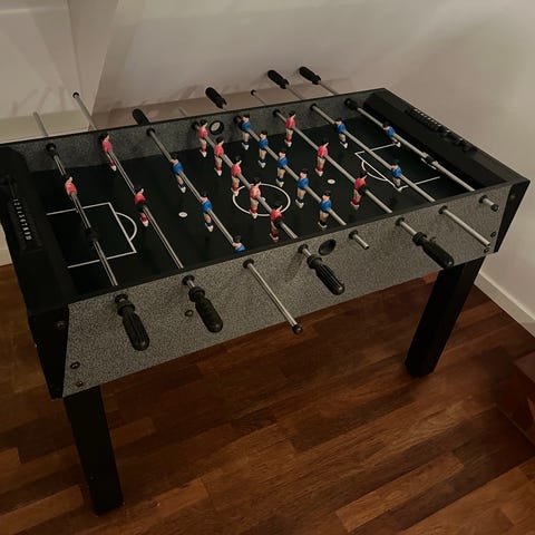 Bordet er produceret i høj kvalitet af træ og metal + spillere i plastik, der er malet i de originale farver fra finalekampen. Der medfølger to bolde. Mål: 122x62x80 cm. Er samlet og klar til brug.