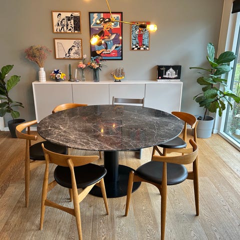 Gubi beetle dining table with grey emperador marble table top in 75 x 75 cm. Height is 70,5 cm