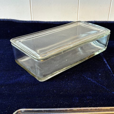 Låget har på indersiden op under kanten et skår på hver side af langsiderne - se fotos.