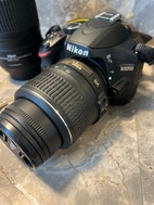 Nikon D3200 digitalkamera med tilhørende objektiver, herunder et 18-55mm og et 55-200mm VR ED objektiv. Kameraet er sort og leveres med batteri, oplader, rem, og en kamerataske til opbevaring og transport. Velegnet til fotografering med variabel zoom og billedstabilisering.