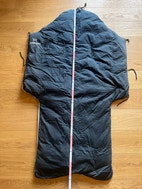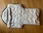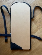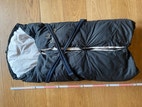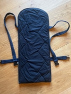 God voksipose, brugt til to børn. Ingen huller i pose eller stof, der er dog et hjørne i fodenden brættet i bæredelen, der er knækket. Brættet kan udskiftes og det har ingen praktisk betydning.
