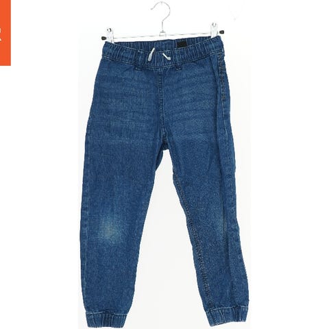 Et par blå jeans med almindelig pasform. Forsiden har to skrålommer og en møntlomme, og bagsiden har to påsatte lommer. Bukserne har lynlås og knaplukning ved linningen.