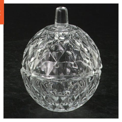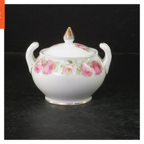 Dette er en dekorativ sukker skål med låg. Skålen er lavet af porcelæn og har en diameter på 10 cm. Den har et farverigt blomsterdesign med guld accenter og en dyb rød farve. Håndtagene og lågknoppen tilføjer et elegant udseende.