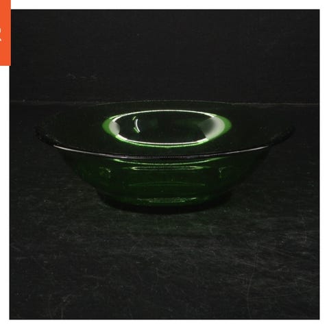 Et rundt glasfad med en diameter på 33 cm. Fadet har et detaljeret mønster i glasset og en let forhøjet kant.