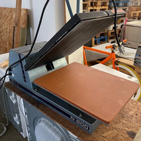 Manuelt presse monteret på et robust stålbord med hylder til opbevaring. Velegnet til præcisionspresning og mindre industrielle opgaver. Fremstillet af metal, grå farve. Passer til værksted eller industrielt miljø.