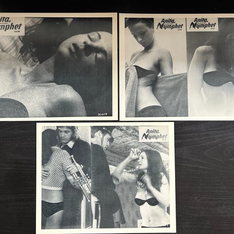 Fem lobby cards fra 70’ernes internationale sexkomedier, bl.a. The Bed Hostesses, Come On, Take Off Your Dress og Alvin Rides Again.