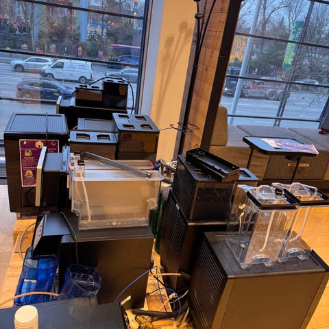 Franke 850 kaffemaskine i sort farve. Maskinen har en stor touchskærm til valg af forskellige kaffevarianter og integreret kværn. Den er designet til kommercielt brug med kapacitet til flere kopper og indeholder et køleskab til opbevaring af mælk. Materialet er primært sort plast og metal. Velegnet til brug i caféer, kontorer eller lignende miljøer.