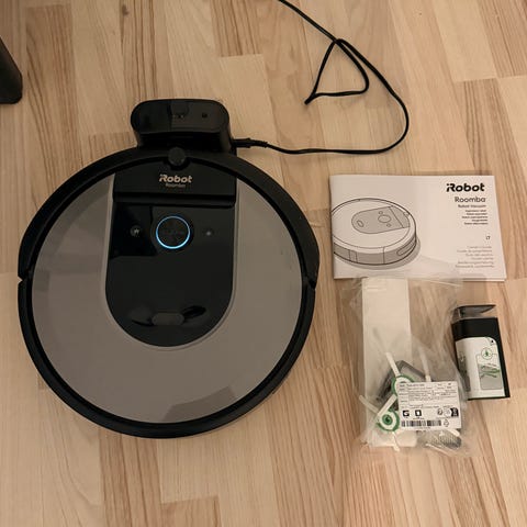 iRobot Roomba i7 robotstøvsuger i sort farve. Inkluderer ladestation og ekstra sidebørste. Designet til automatiseret gulvrengøring med avanceret navigation og effektiv støvsugning. Velegnet til hjem med forskellige gulvtyper.