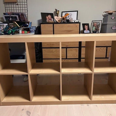 Reol med flere rum og skuffer i lys træ. Den er velegnet til opbevaring i forskellige rum.