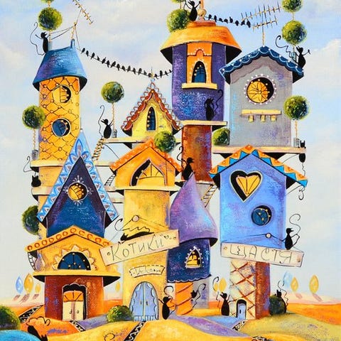 Et markant og moderne værk af den rumænsk-danske kunstner Mircea Pop, kendt for sine ekspressive farver, geometriske kompositioner og stærke symbolske fortællinger.