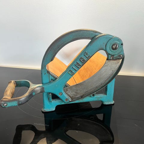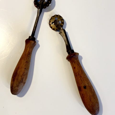 Antik dejskærer med håndtag i træ og skærehjul i metal. Værktøjet er designet til at skære dej i ønskede former og størrelser hovedsaglig klejner