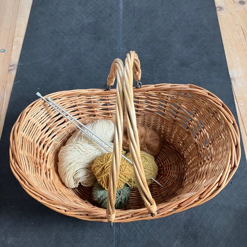 Spændende kurv i groft pileflet, omvundet med plantefibre.