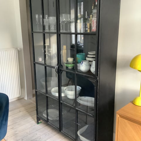 Nordal Liao vitrineskab i sort lakeret jern m. jernlameller og glas på hylderne, der giver et unikt udtryk.