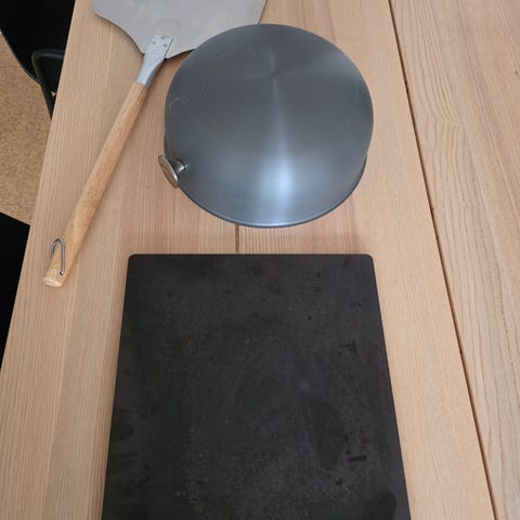 Gorenje pizzasten med tilhørende spade. Stenen er rektangulær og velegnet til bagning af pizza og lignende bagværk for at opnå sprød bund. Spaden har et håndtag for nem håndtering.